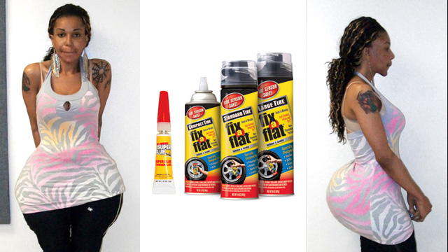 Not for nothing but when you show up for your under-the-table surgery for butt implants and this walk of life shows up to do it, at what point do you say to yourself ‘hmmm, I really don’t want my ass to look like that thing’s. Maybe I shouldn’t go through with this.’ This woman really isn’t a good walking advertisement for herself so I’m gonna go ahead and presume that all of her clients are blind. I’m not too sure when black women all the sudden needed butt implants but I’m sure this idiots thought process was simple. ‘Fix-A-Flat is used to prevent tires from going flat, so it must also prevent asses from deflating.’ She was probably better off sticking an air pump up the woman’s ass and manually blowing it up. Just as effective.