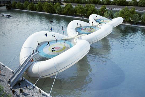 EliteDaily: Paris has plans to add some serious fun to its gorgeous, historic city, as an inflatable trampoline bridge will have people bouncing across the Seine. The inflatable trampoline bridge has been proposed as a part of the Archtriumph competition in the French capital of Paris. Located near the Pont de Bir-Hakeim bridge, the structure would be constructed of floating PVC buoys, each 30 meters in diameter. “Each module under tension – filled with 3700 cubic meters of air – develops in space with an arch-like form,” says architects AZC, who add that the design is “dedicated to the joyful release from gravity as one bounces above the river.” They describe the bridge as something “fun and frivolous” to contrast what they consider “stressful Paris.” “It appears to us that Paris has the bridges and passages necessary for the flow of vehicular and pedestrian traffic across its waterways,” the firm writes on its website. “Our intention is to invite its visitors and inhabitants to engage on a newer and more playful path across this same water.”